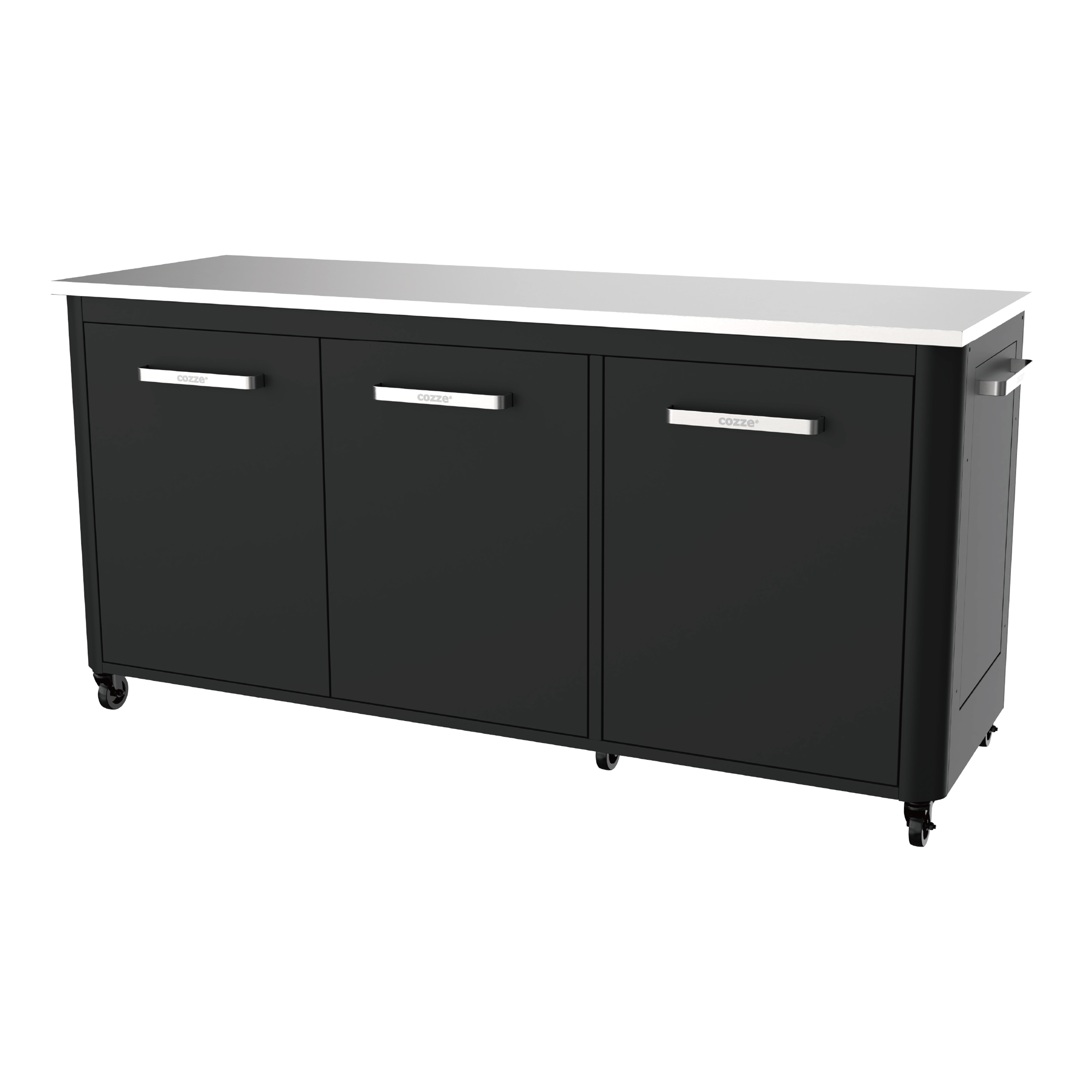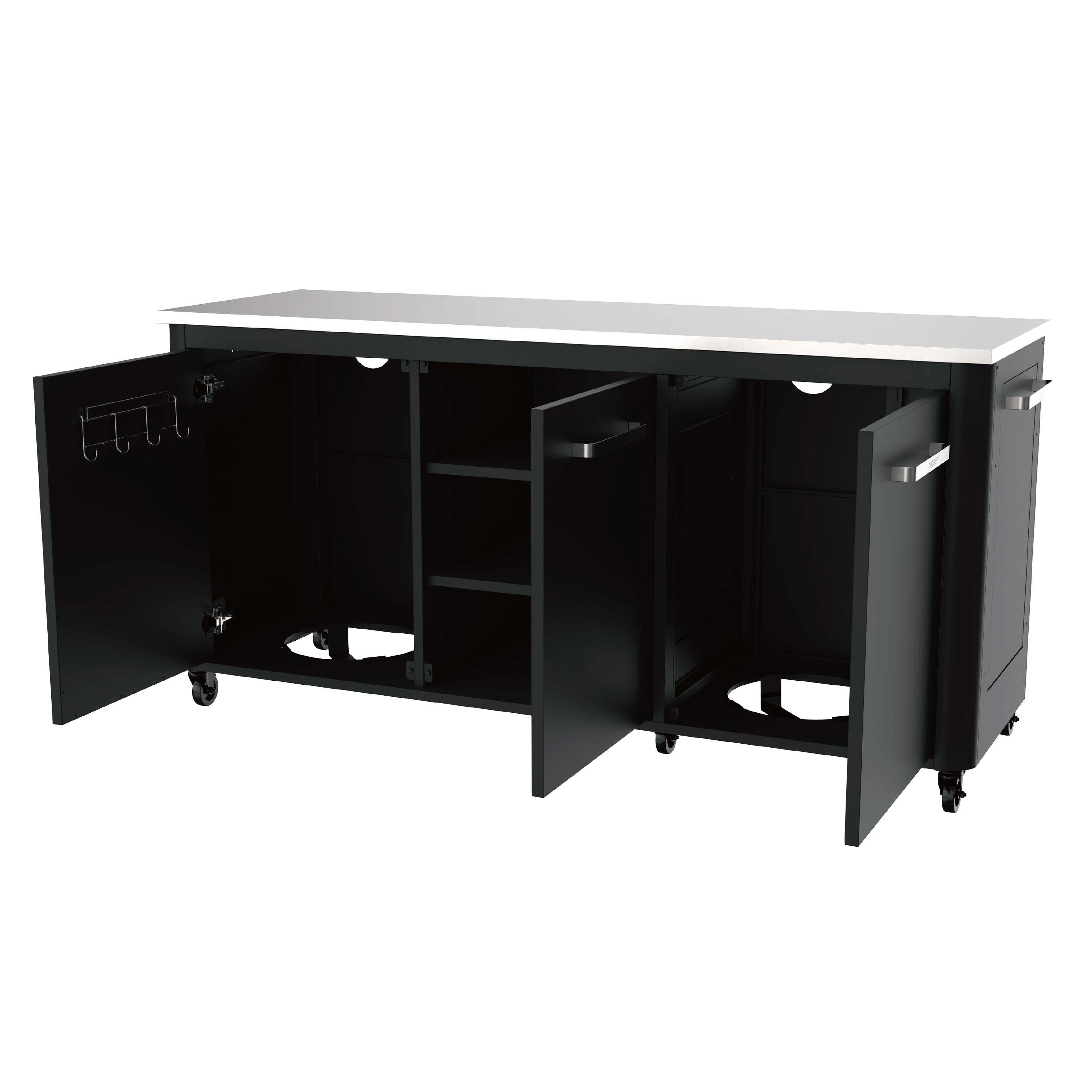 Der Tisch besteht aus verzinktem lackiertem schwarzem Stahl, besitzt eingebaute Mülleimer und drei Türen, sowie sechs starke Räder mit 75 mm Durchmesser, die elektroverzinkt sind und eine schwarzer Pulverbeschichtung haben.