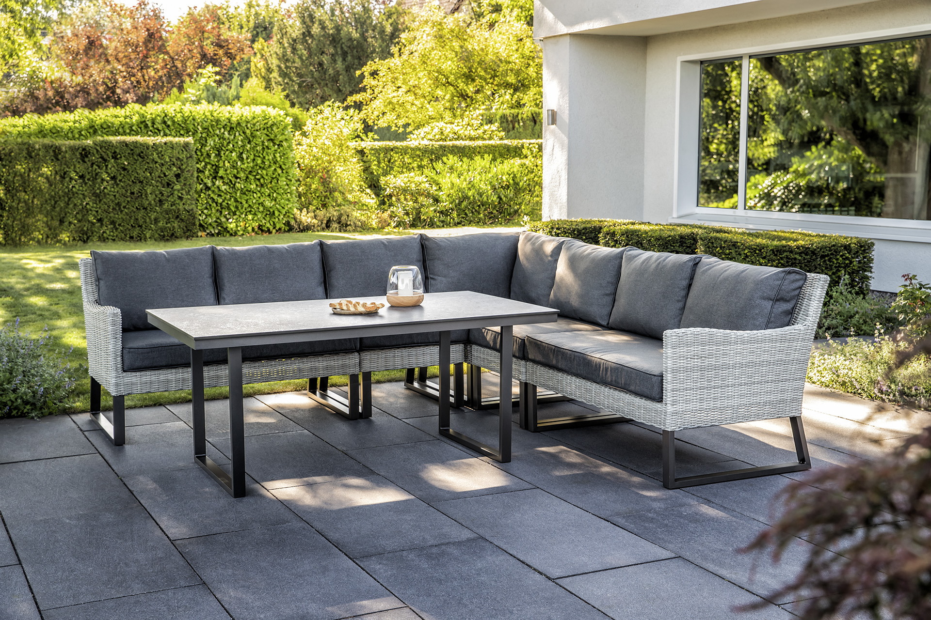 Modular casual dining sets make it possible: whether enjoying the sunset with a glass of wine in your hand or spending a convivial barbecue. Modern shapes, combined with soft, Mediterranean-style mesh create plenty of space for cozy hours at home wi